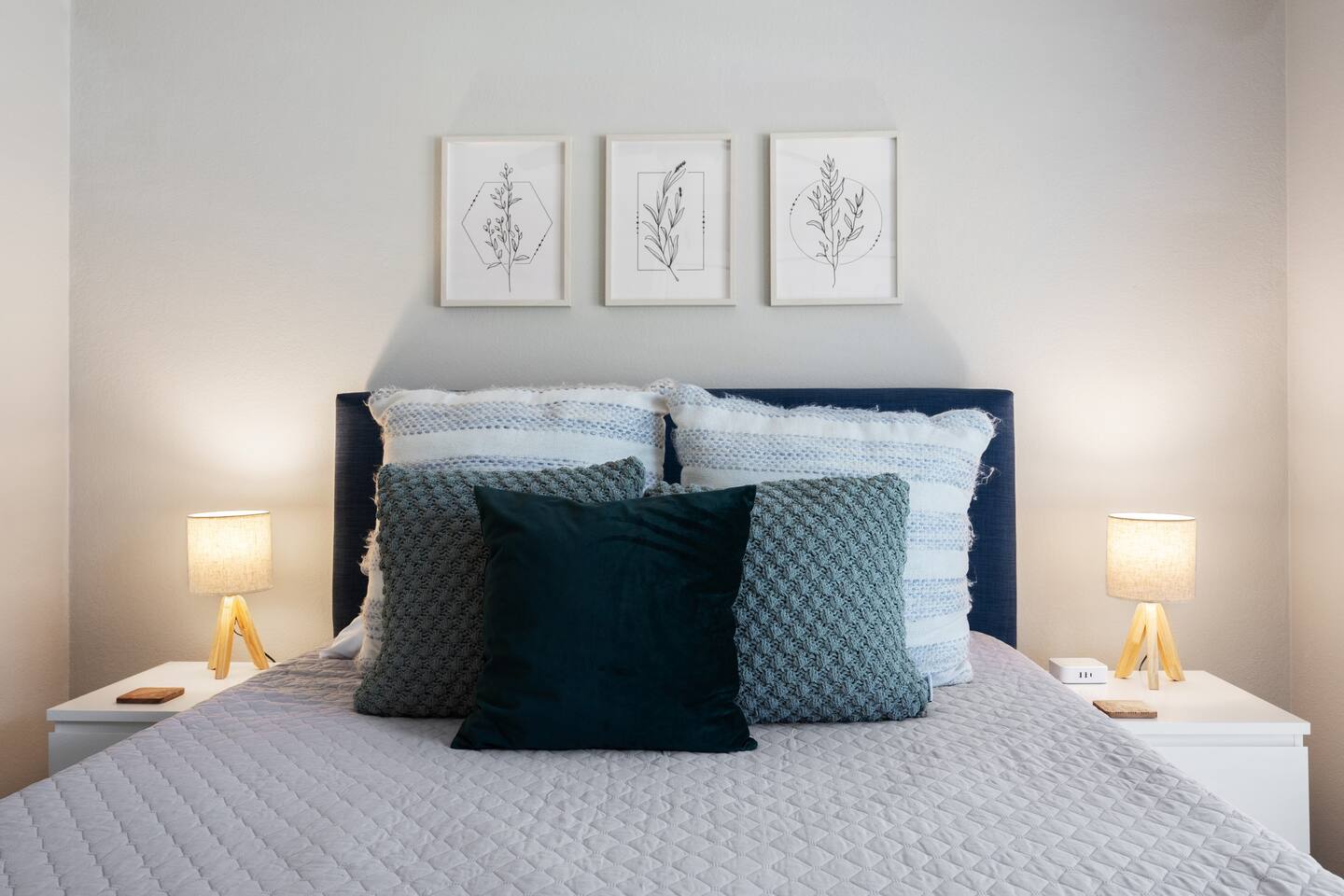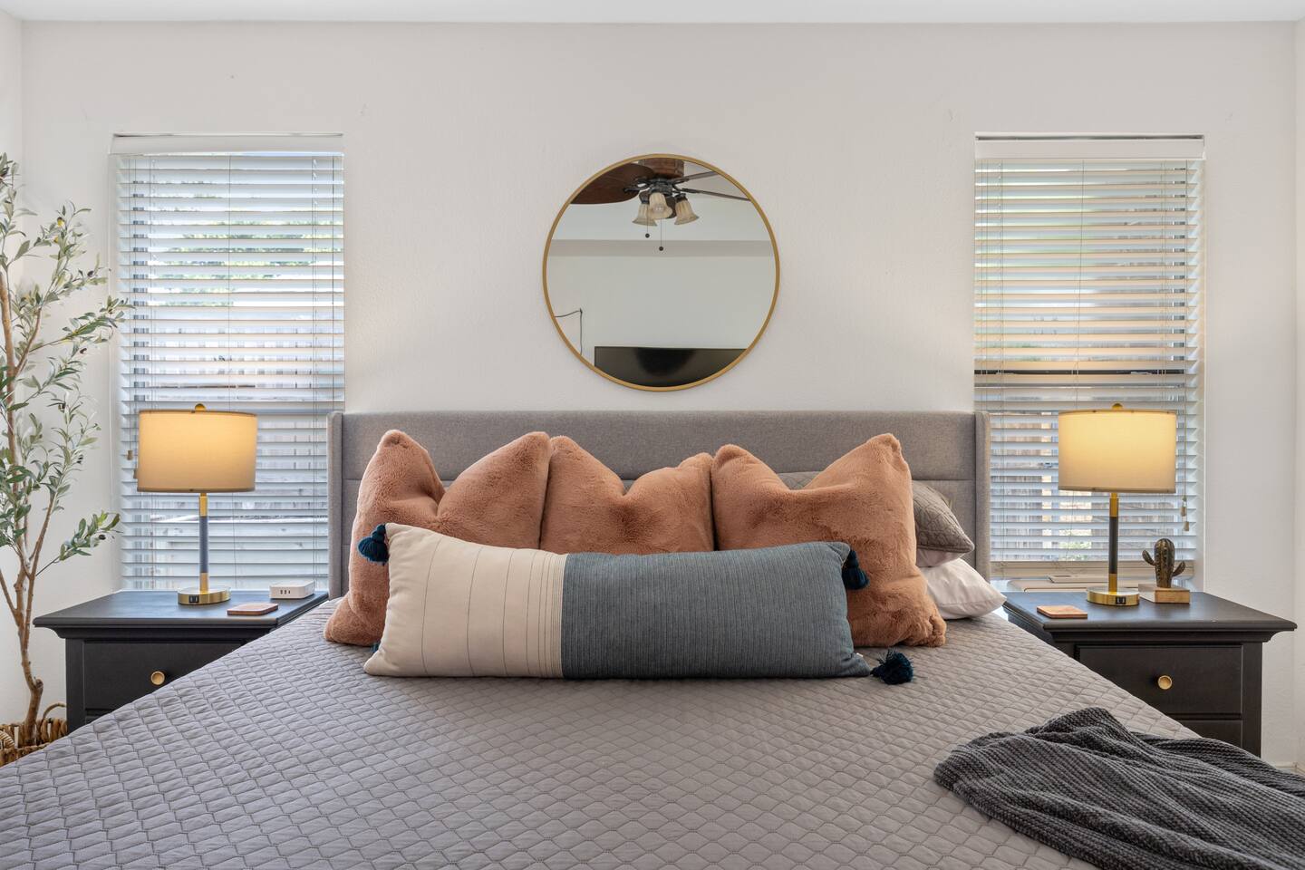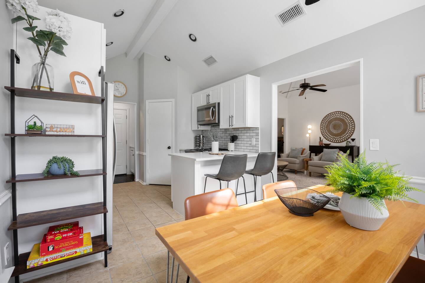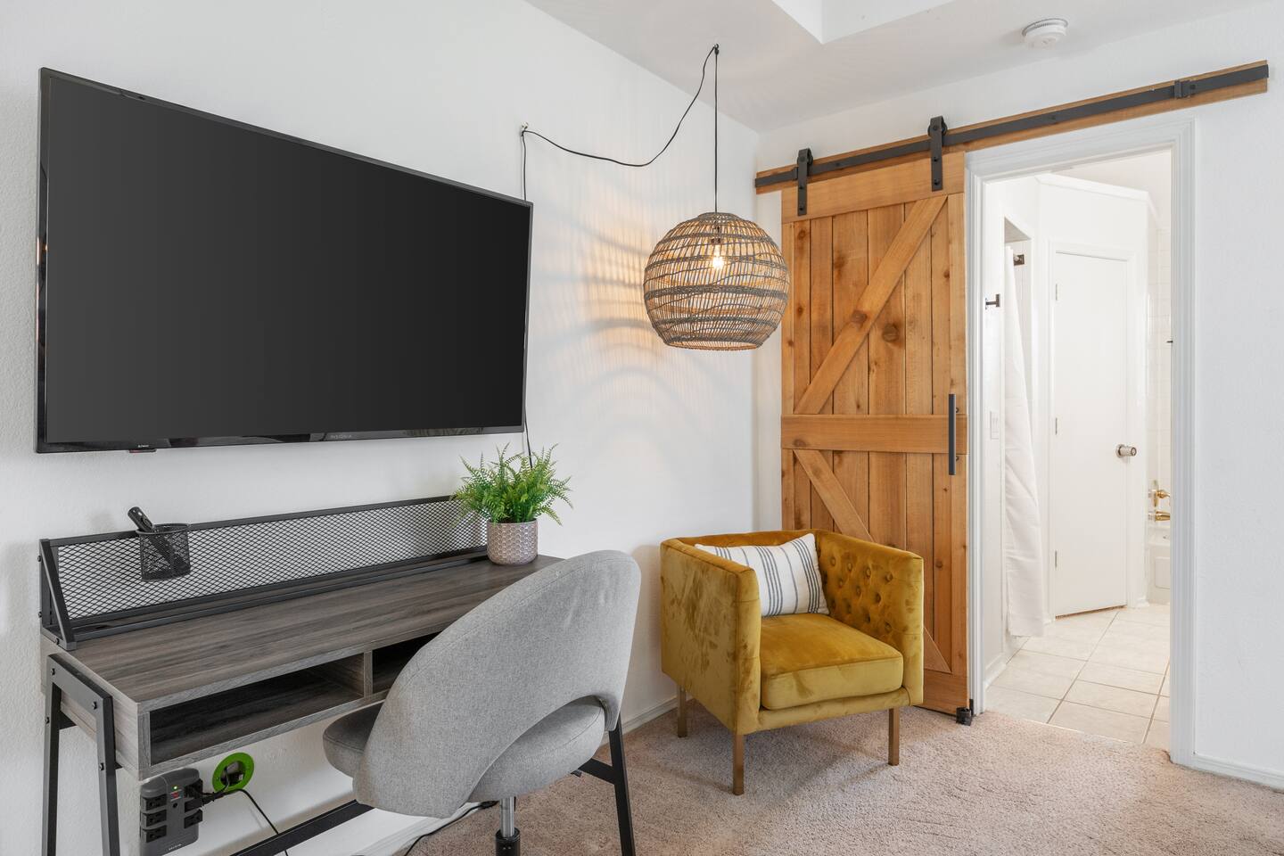 King Suite with Ensuite Bathroom: - Privately located at the back of the house - King memory foam mattress - Desk with office chair and high speed internet - Smart TV - Ensuite Bathroom with soaking tub and walk-in shower - Stocked with shampoo, conditioner & body wash - Additional AC unit for maximum cooling - luggage rack - Extra extension outlet for all your electronics Guest Bedroom #1 - Queen memory foam mattress - Large closet - Luggage rack - Extension outlet Guest Bedroom #2 - Queen memory foam mattress - Large closet - Luggage rack - Extension outlet - Pack n Play - High Chair Guest Bathroom - Conveniently located off of the main living area, separating both Guest bedrooms - Stocked with shampoo, conditioner, & body wash Kitchen and Dinning Room: - Stocked with Pots & Pans - Includes children's plates, cups and utensils - Games - Keurig Duo with K-cups for your enjoyment - Front loading LG Washer and Dryer Living Room: - Large Sofa and chairs, seating for 6 - Fireplace - Smart TV Patio: - Large table and chairs - BBQ Grill - Outdoor Lighting - Opens up to large backyard *Private 2 Car Garage with garage door remote for your convenience