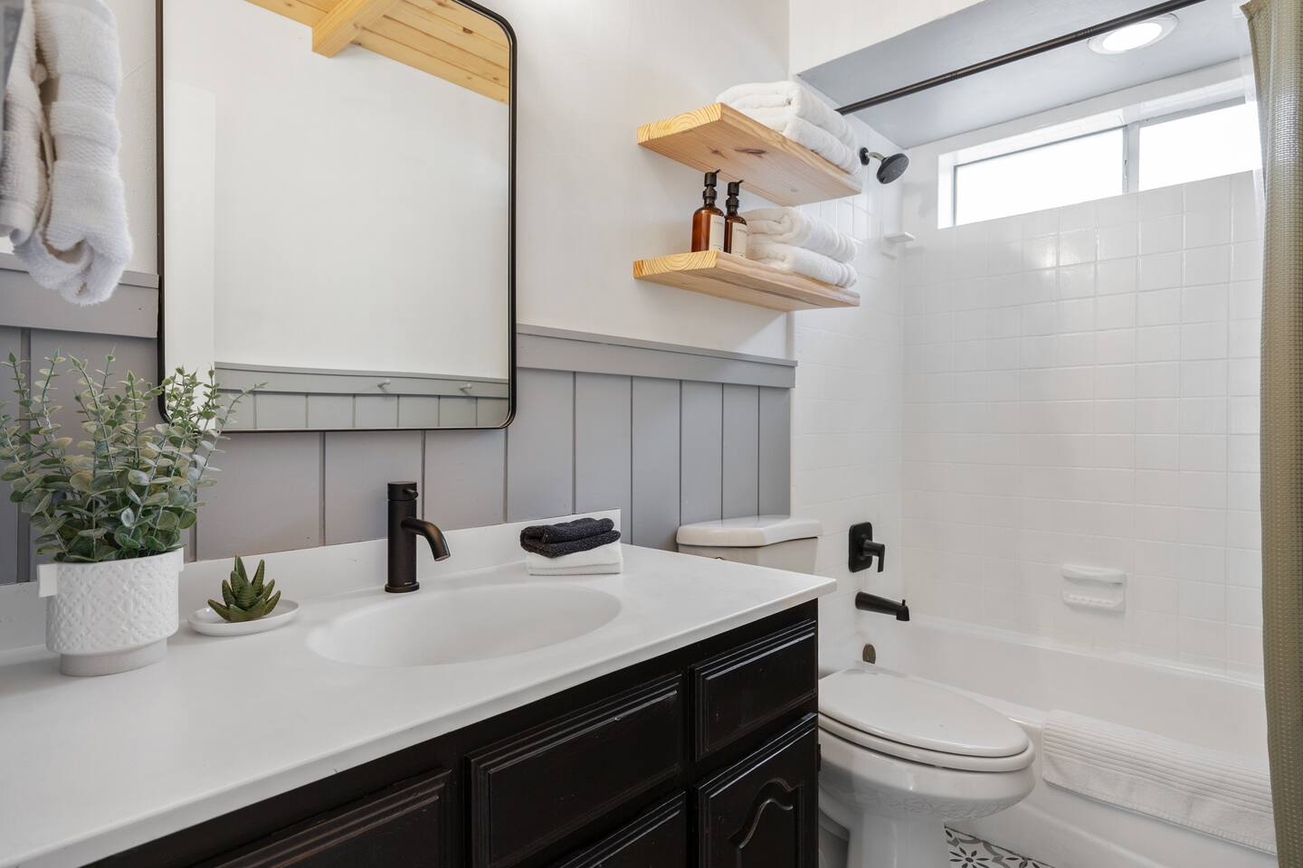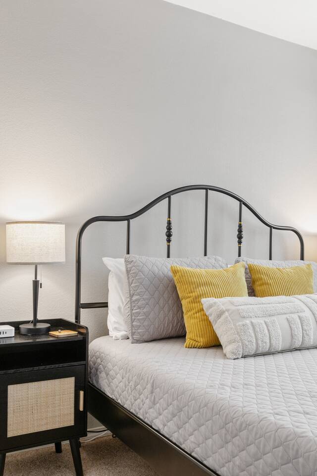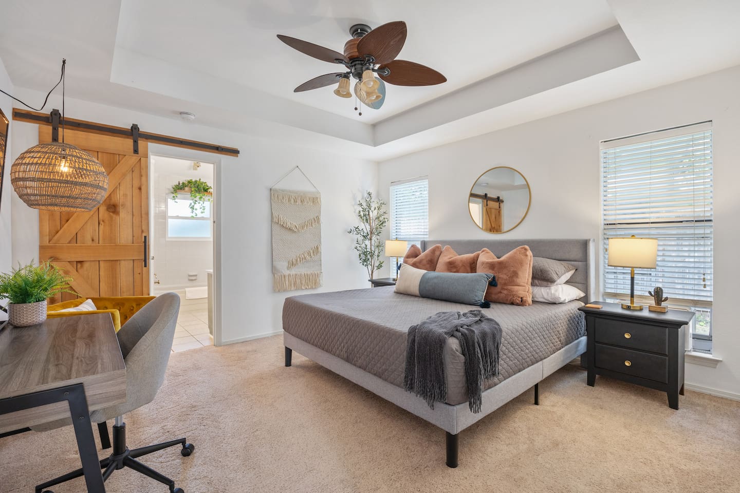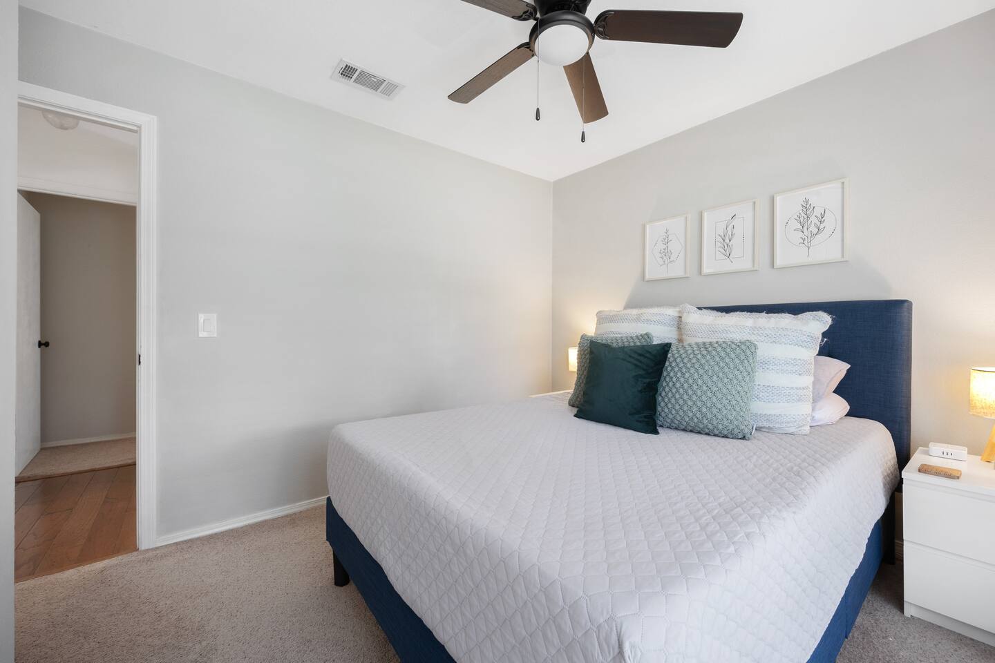 King Suite with Ensuite Bathroom: - Privately located at the back of the house - King memory foam mattress - Desk with office chair and high speed internet - Smart TV - Ensuite Bathroom with soaking tub and walk-in shower - Stocked with shampoo, conditioner & body wash - Additional AC unit for maximum cooling - luggage rack - Extra extension outlet for all your electronics Guest Bedroom #1 - Queen memory foam mattress - Large closet - Luggage rack - Extension outlet Guest Bedroom #2 - Queen memory foam mattress - Large closet - Luggage rack - Extension outlet - Pack n Play - High Chair Guest Bathroom - Conveniently located off of the main living area, separating both Guest bedrooms - Stocked with shampoo, conditioner, & body wash Kitchen and Dinning Room: - Stocked with Pots & Pans - Includes children's plates, cups and utensils - Games - Keurig Duo with K-cups for your enjoyment - Front loading LG Washer and Dryer Living Room: - Large Sofa and chairs, seating for 6 - Fireplace - Smart TV Patio: - Large table and chairs - BBQ Grill - Outdoor Lighting - Opens up to large backyard *Private 2 Car Garage with garage door remote for your convenience
